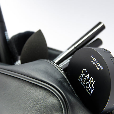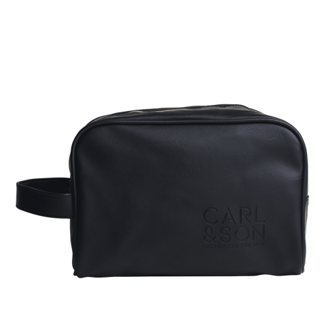En svart vegansk necessär, med Carl&Son loggan tryckt på sidan. Inuti finns en större och två mindre innerfickor.